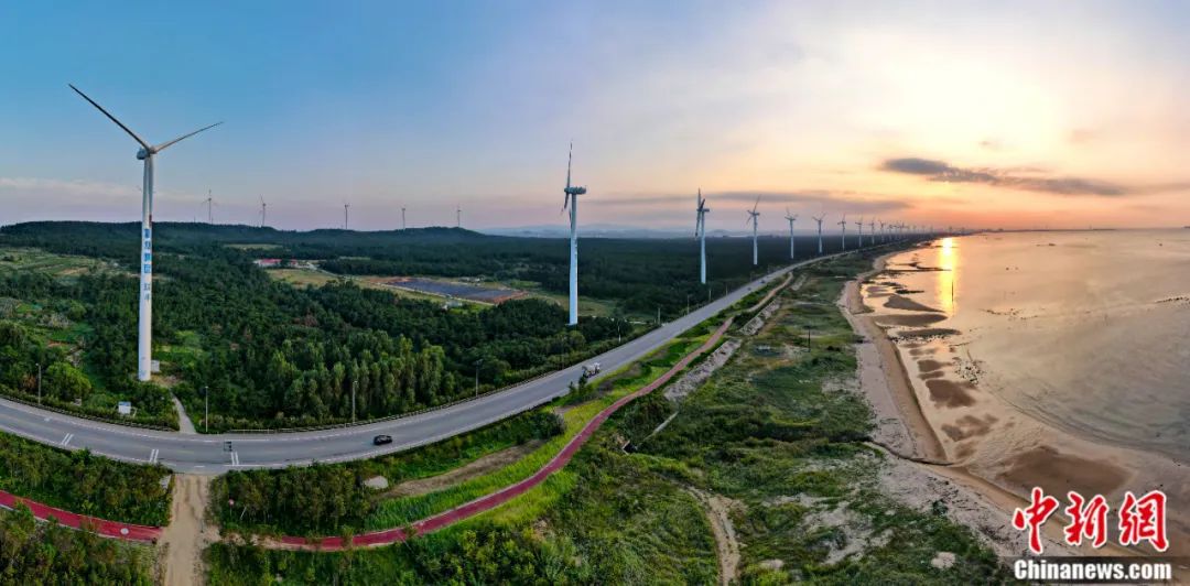 山東省榮成市北環(huán)海路,風力發(fā)電機與沿海防護林形成一道靚麗的風景線。近年來,中國大力推廣風電產業(yè)等“綠色能源”,實現生態(tài)保護和可持續(xù)發(fā)展。楊志禮 攝