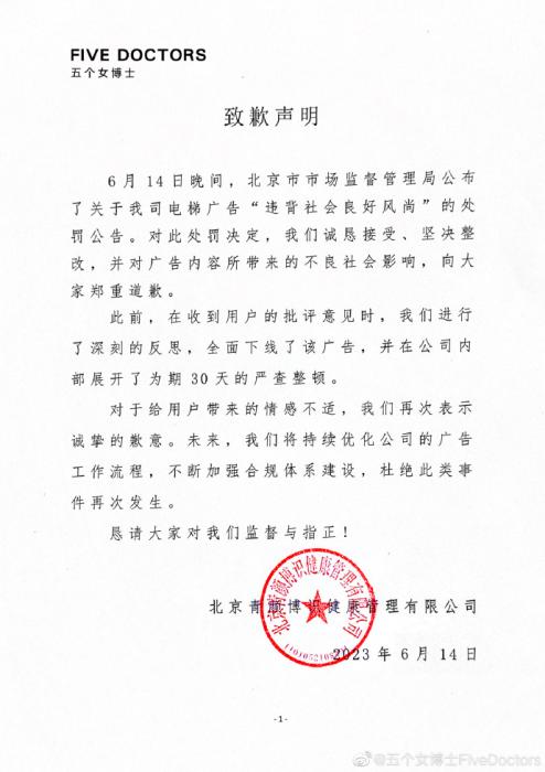 6月14日晚,“五個(gè)女博士”也在其微博發(fā)布致歉聲明稱,對(duì)此處罰決定,誠懇接受、堅(jiān)決整改,并對(duì)廣告內(nèi)容所帶來的不良社會(huì)影響,向大家鄭重道歉。