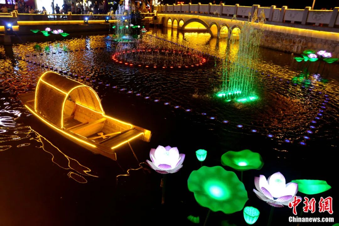 江蘇省張家港市, 夜色下,點亮池塘的“荷花”、噴泉、船兒與美麗水波紋,吸引市民與游客駐足欣賞。楊木軍 攝