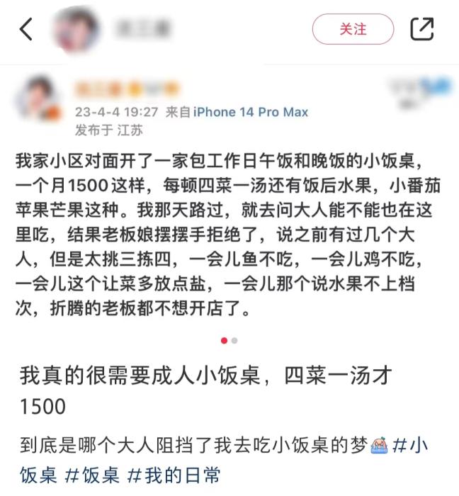 也有網(wǎng)友表示,由于自己吃太多,還被小飯桌漲了價?!耙?yàn)槌扇撕蛯W(xué)生食量和需求不同,價格都需要跟小飯桌重談?!?/p>
