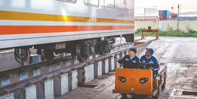 中國師父毛鑫(右)與學(xué)員彼得·恩堅(jiān)加在內(nèi)羅畢站區(qū)運(yùn)轉(zhuǎn)車間內(nèi)調(diào)度車輛。