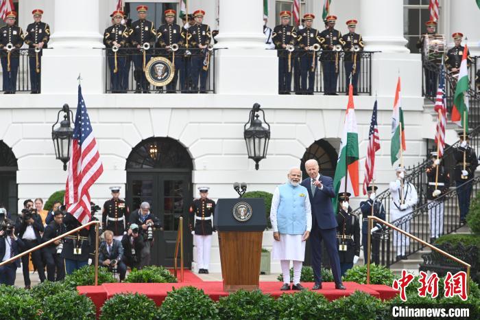 當(dāng)?shù)貢r(shí)間6月22日,印度總理莫迪對(duì)美進(jìn)行國(guó)事訪問(wèn)。圖為美國(guó)總統(tǒng)拜登與莫迪出席白宮歡迎儀式。中新社記者 陳孟統(tǒng) 攝