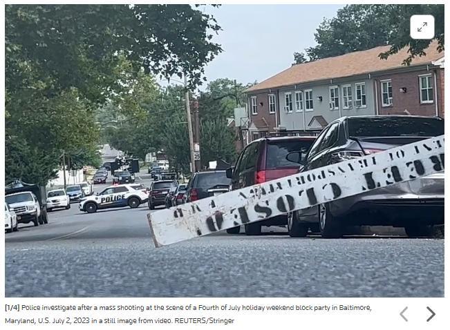 當(dāng)?shù)貢r(shí)間7月2日凌晨,美國(guó)馬里蘭州巴爾的摩的一場(chǎng)社區(qū)派對(duì)結(jié)束后,發(fā)生了大規(guī)模槍擊事件,造成2人死亡,28人受傷,其中包括14名未成年人。圖片來(lái)源:路透社報(bào)道截圖