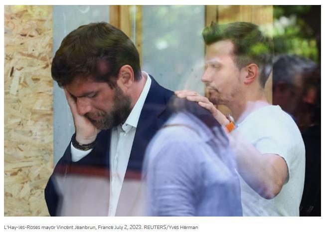 當(dāng)?shù)貢r(shí)間7月2日,家中遭襲擊后的法國(guó)拉伊萊羅斯市市長(zhǎng)讓布蘭。圖片來(lái)源:路透社報(bào)道截圖