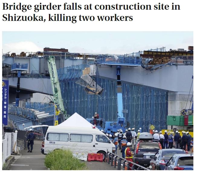 報道稱,當時約20名施工人員在靜岡市國道1號上進行夜間高架橋搭建作業(yè)。長約65米、重約140噸的高架橋鋼架突然折斷,并從約九米高處墜地。當局稱,施工人員當時正在調(diào)整鋼架的水平方向。