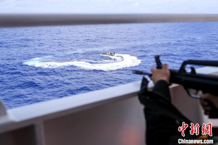 兩發(fā)紅色信號彈升空,一聲長汽笛響徹海域。指揮所通過16國際頻道用英語向高速接近的“海盜艇”發(fā)出警告:“你迅速離開,否則后果自負(fù)?!彪S船取證人員全程照相、錄像取證。