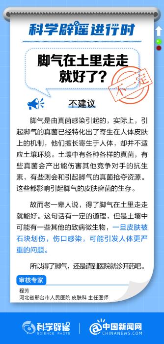 老一輩人說,得了腳氣在土里走走就能好。這句話有一定的道理,但是土壤中可能有一些其他的致病微生物,一旦皮膚被石塊劃傷,傷口感染,可能引發(fā)人體更嚴(yán)重的問題。所以得了腳氣,還是請(qǐng)到醫(yī)院就診開藥吧。(來源:科學(xué)辟謠、中國(guó)新聞網(wǎng)微博)