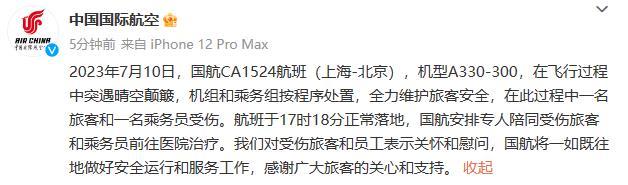 事后,據(jù)國航回應(yīng),在此過程中一名旅客和一名乘務(wù)員受傷。航班于17時(shí)18分正常落地,國航安排專人陪同受傷旅客和乘務(wù)員前往醫(yī)院治療。