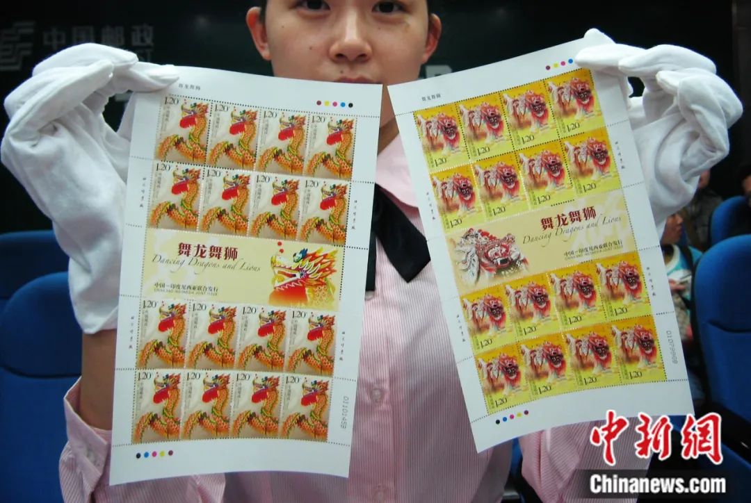 2007年,中華人民共和國(guó)與印度尼西亞共和國(guó)兩國(guó)郵政聯(lián)合發(fā)行《舞龍舞獅》特種郵票一套兩枚,內(nèi)容分別為中國(guó)的舞龍和印尼的舞獅,以表現(xiàn)兩國(guó)各具特色的民間文化傳統(tǒng)。圖為工作人員展示該郵票圖稿。郭虹 攝