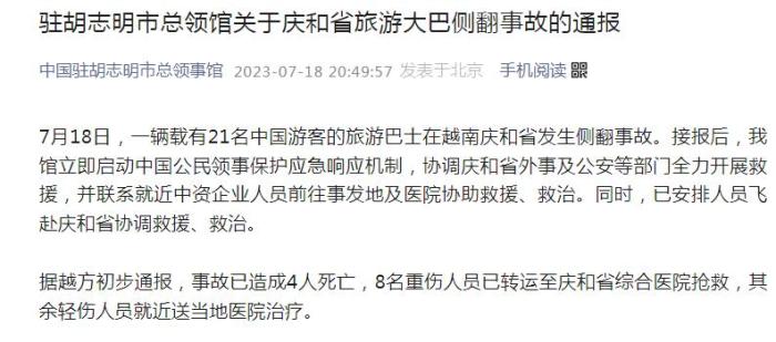 中新網7月18日電 據(jù)中國駐胡志明市總領事館微信公眾號18日消息,7月18日,一輛載有21名中國游客的旅游巴士在越南慶和省發(fā)生側翻事故。