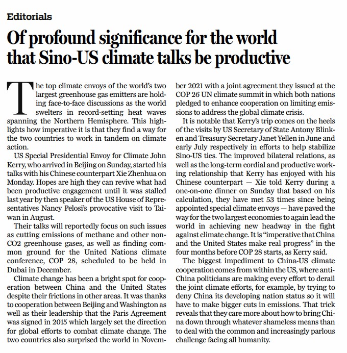 在舉世關(guān)注中,世界最大的兩個經(jīng)濟體的氣候特使舉行了面對面會談。當前,北半球正在經(jīng)歷創(chuàng)紀錄的熱浪,凸顯了中美在氣候問題上攜手合作多么重要。