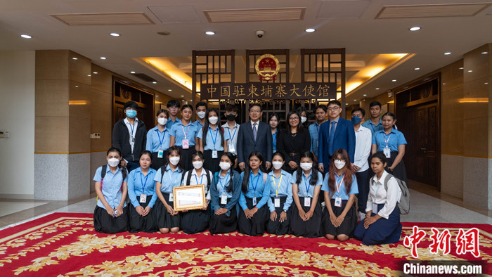 圖為中國駐柬埔寨大使王文天與參加活動的柬埔寨亞歐大學(xué)師生合影。 中國駐柬大使館 供圖