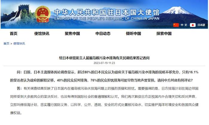 中新網(wǎng)7月19日電 據(jù)中國駐日本大使館網(wǎng)站消息,中國駐日本使館發(fā)言人就福島核污染水排海有關(guān)民調(diào)結(jié)果答記者問時表示,日方排海計劃在周邊鄰國同樣受到大多數(shù)民眾的堅決反對,也沒有得到國際社會的普遍理解和認(rèn)可;再次敦促日方正視國內(nèi)外合理關(guān)切和反對聲音,立即叫停排海計劃。