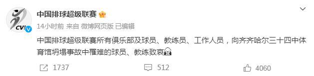 中新網(wǎng)7月25日電 據(jù)中國(guó)排球超級(jí)聯(lián)賽官微25日消息,中國(guó)排球超級(jí)聯(lián)賽所有俱樂部及球員、教練員、工作人員,向齊齊哈爾三十四中體育館坍塌事故中罹難的球員、教練致哀。