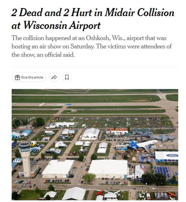 據(jù)《紐約時報》報道,美國聯(lián)邦航空管理局(FAA)稱,事故發(fā)生在威斯康星州奧什科什的惠特曼地區(qū)機場。在為期一周的活動中,“實驗飛機協(xié)會”在此舉辦飛行表演和航展。
