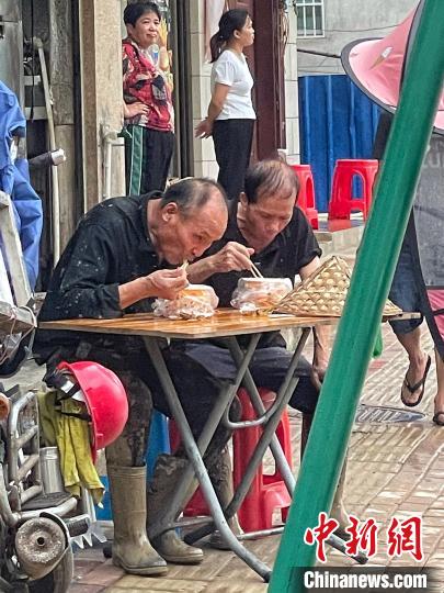村中,七旬的吳大爺和數(shù)名年齡相近的村民,已自發(fā)幫助清理村中街道長達(dá)11個小時。17時許,吳大爺在街邊攤位吃著面條,稍作歇息后,他將重新投入清理工作。