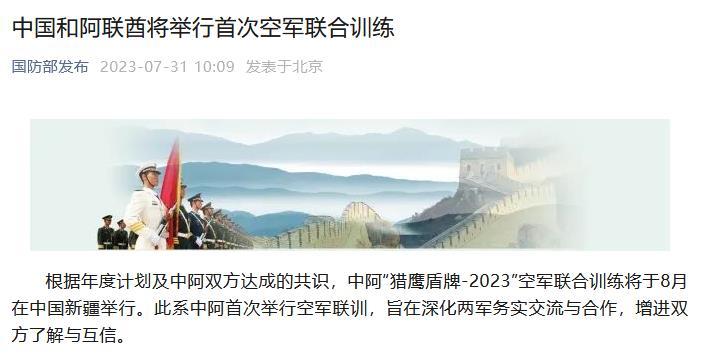 中新網(wǎng)7月31日電 據(jù)“國防部發(fā)布”微信公眾號31日消息,根據(jù)年度計劃及中阿雙方達(dá)成的共識,中阿“獵鷹盾牌-2023”空軍聯(lián)合訓(xùn)練將于8月在中國新疆舉行。此系中阿首次舉行空軍聯(lián)訓(xùn),旨在深化兩軍務(wù)實交流與合作,增進(jìn)雙方了解與互信。