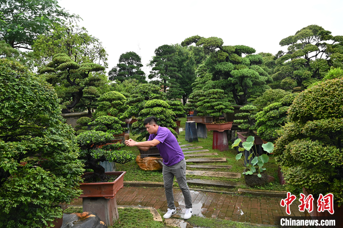 圖為7月18日,廣東佛山,王俞又在嘉盛園藝總場介紹盆景養(yǎng)護技巧。 中新社記者 陳楚紅 攝