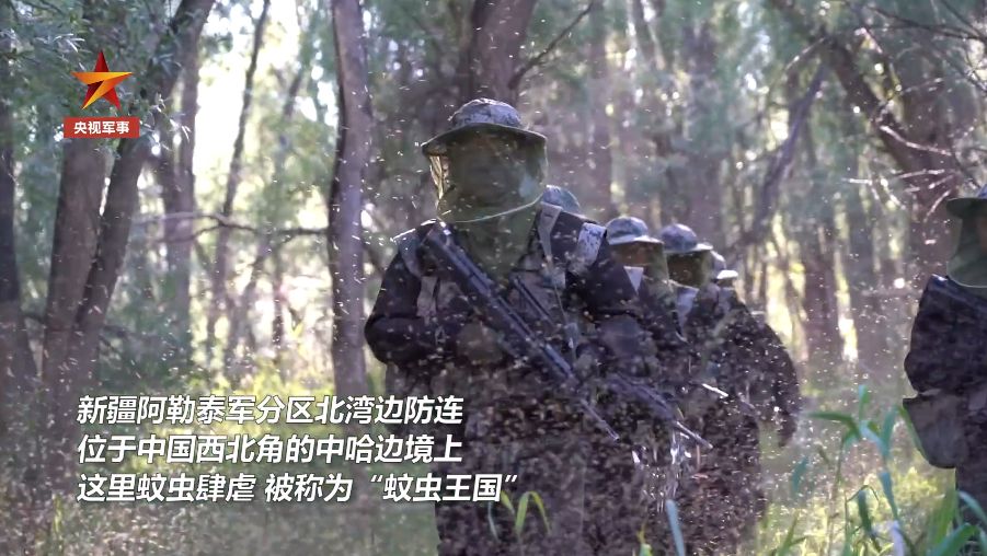 新疆阿勒泰軍分區(qū)北灣邊防戰(zhàn)士穿行蚊子群巡邏。一路上數以萬計的蚊子、蠓蟲撲面而來。圖片來源:央視軍事視頻截圖