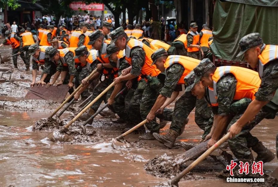 2023年7月4日,重慶市萬州區(qū)五橋河河水猛漲,武警重慶總隊執(zhí)勤第三支隊官兵在清理街道淤泥。