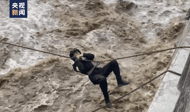 2022年9月5日,四川甘孜州瀘定縣發(fā)生6.8級地震,磨西鎮(zhèn)與青崗坪交匯處,湍急的流水攔住去路。甘孜特警隊員們用身體和繩索搭建橋梁,徒手爬繩索前往對岸救援。圖片來源:央視新聞視頻截圖