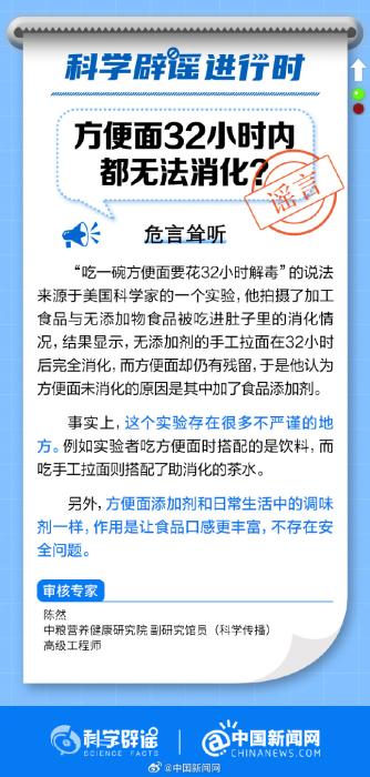 中新網(wǎng)8月1日電 “吃一碗方便面要花32小時解毒”的說法來源于美國科學家的一個實驗,但這個實驗存在很多不嚴謹?shù)牡胤?。方便面添加劑和日常生活中的調味劑一樣,作用是讓食品口感更豐富,不存在安全問題。(來源:@科學辟謠 @中國新聞網(wǎng) )