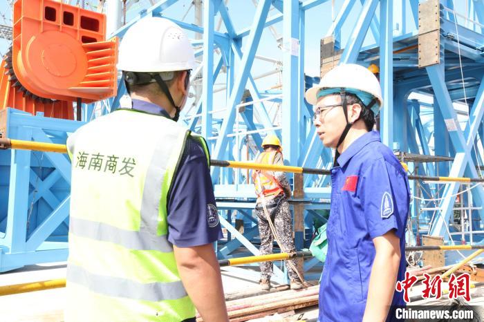 圖為首俊明在海南商業(yè)航天發(fā)射場1號工位向工人了解項目建設(shè)進(jìn)展。符宇群攝