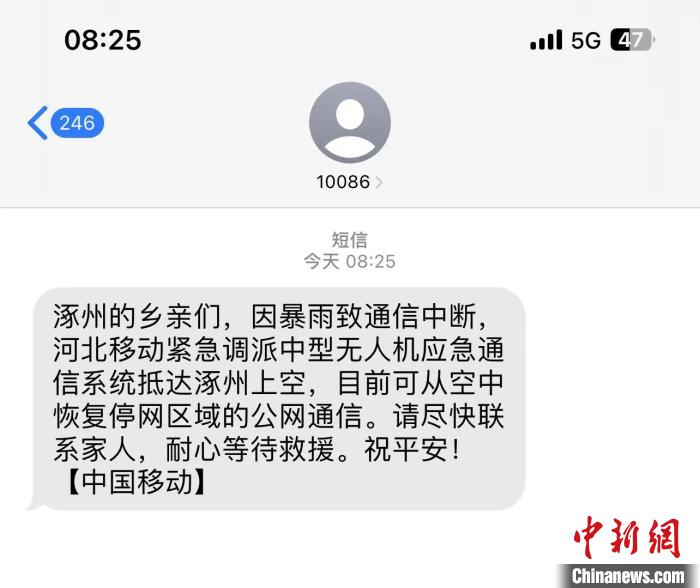 中新網(wǎng)石家莊8月3日電 (郝燁 趙景科)“【中國(guó)移動(dòng)】涿州的鄉(xiāng)親們,因暴雨致通信中斷,河北移動(dòng)緊急調(diào)派中型無人機(jī)應(yīng)急通信系統(tǒng)抵達(dá)涿州上空,目前可從空中恢復(fù)停網(wǎng)區(qū)域的公網(wǎng)通信。請(qǐng)盡快聯(lián)系家人,耐心等待救援。祝平安!”8月3日早,河北涿州災(zāi)區(qū)的群眾收到一條來自空中的短信。