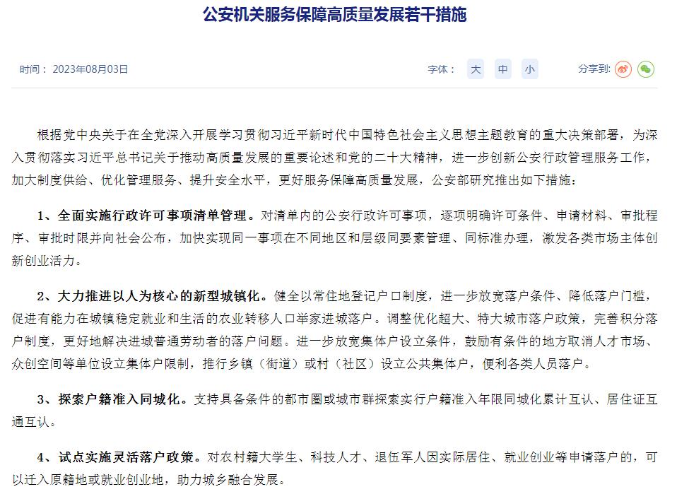 8月3日,公安部發(fā)布公安機關(guān)服務(wù)保障高質(zhì)量發(fā)展若干措施,其中在戶籍政策方面提出一系列舉措。