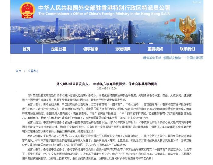 中新網(wǎng)8月3日電 據(jù)外交部駐港公署網(wǎng)站消息,針對英國政府發(fā)布更新2023年《海外經(jīng)營風(fēng)險(xiǎn)指南:香港》,污名化香港國安法和新選舉制度,無理詆毀香港民主、自由、人權(quán)狀況,肆意抹黑“一國兩制”成功實(shí)踐,粗暴干預(yù)香港事務(wù)和中國內(nèi)政,外交部駐港公署表示強(qiáng)烈譴責(zé)和堅(jiān)決反對。