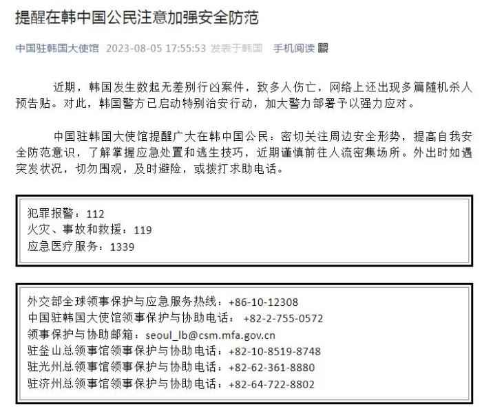 中新網(wǎng)8月5日電 據(jù)中國駐韓國大使館微信公眾號(hào)5日消息,近期,韓國發(fā)生數(shù)起無差別行兇案件,致多人傷亡,網(wǎng)絡(luò)上還出現(xiàn)多篇隨機(jī)殺人預(yù)告貼。對此,韓國警方已啟動(dòng)特別治安行動(dòng),加大警力部署予以強(qiáng)力應(yīng)對。