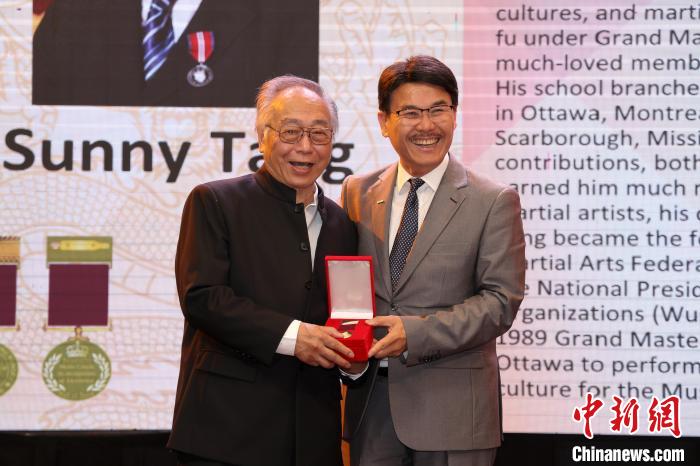 7日,國際武術聯(lián)合會執(zhí)行委員、加拿大武術團體聯(lián)合總會會長鄧華(左)獲頒國際武術功夫名人堂勛章。中新社記者 余瑞冬 攝