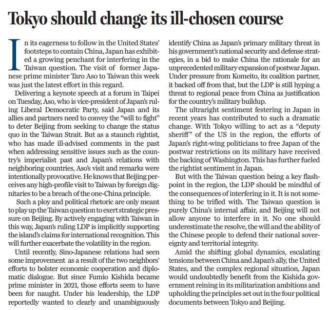 身為日本執(zhí)政的自民黨副總裁,麻生太郎周二在臺發(fā)表演講,口出狂言,大放厥詞,說什么日本及其盟友和伙伴要對外傳達“戰(zhàn)斗意志”。作為頑固的右翼分子,麻生竄臺和上述言論完全是蓄意挑釁。任何外國政要高調竄臺都違反一個中國原則,都是對中國內政的粗暴干涉。對此,麻生心知肚明,明知故犯,就是為了渲染臺灣問題,向北京施加戰(zhàn)略壓力。通過與臺積極接觸,日方明里暗里支持臺當局企圖獲得國際承認的癡心妄想,將進一步加劇地區(qū)動蕩。