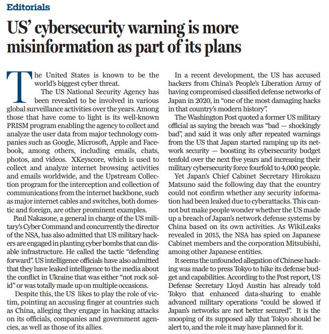盡管如此,美國卻總是裝出一副受害者的樣子,指責(zé)中國等國對(duì)美國及其盟友的官員、企業(yè)和政府機(jī)構(gòu)發(fā)動(dòng)黑客攻擊。最近,美國就指責(zé)中國黑客在2020年入侵了日本防衛(wèi)部門的機(jī)密網(wǎng)絡(luò),稱之為“日本現(xiàn)代史上最具破壞性的黑客攻擊之一”。然而,日本內(nèi)閣官房長官松野博一表示,日本無法確認(rèn)是否有任何安全信息因網(wǎng)絡(luò)攻擊而泄露。這不禁讓人懷疑,美國是否根據(jù)自己的黑客活動(dòng),編造了中國破壞日本網(wǎng)絡(luò)防御系統(tǒng)的故事?維基解密在2015年就披露,美國國家安全局在秘密監(jiān)視日本內(nèi)閣成員和三菱公司,以及其他日本實(shí)體。