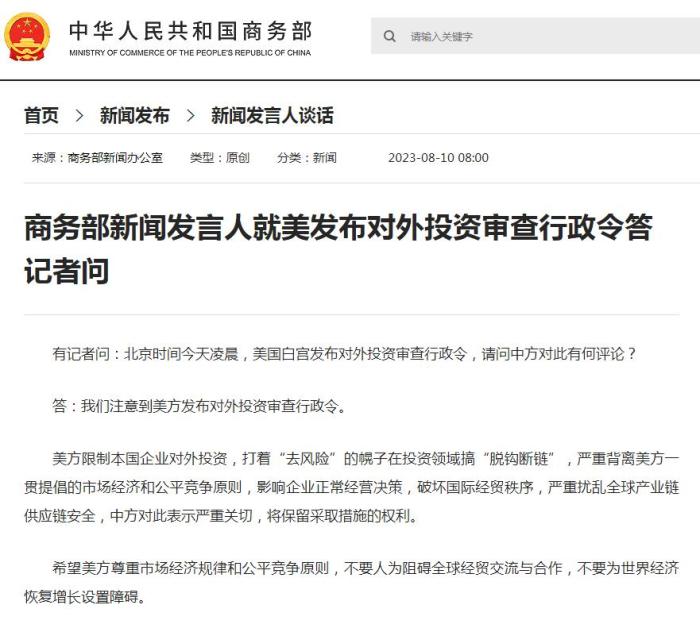 中國商務(wù)部新聞發(fā)言人8月10回應(yīng)稱,美方限制本國企業(yè)對外投資,打著“去風(fēng)險”的幌子在投資領(lǐng)域搞“脫鉤斷鏈”,嚴(yán)重背離美方一貫提倡的市場經(jīng)濟和公平競爭原則,影響企業(yè)正常經(jīng)營決策,破壞國際經(jīng)貿(mào)秩序,嚴(yán)重擾亂全球產(chǎn)業(yè)鏈供應(yīng)鏈安全,中方對此表示嚴(yán)重關(guān)切,將保留采取措施的權(quán)利。