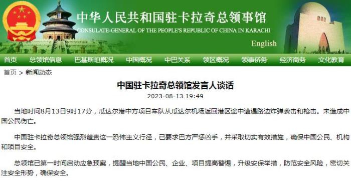 中國駐卡拉奇總領(lǐng)館強烈譴責(zé)這一恐怖主義行徑,已要求巴方嚴懲兇手,并采取切實有效措施,確保中國公民、機構(gòu)和項目安全。