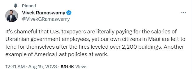 該援烏計(jì)劃出臺(tái)之際,美國(guó)共和黨2024年總統(tǒng)競(jìng)選人維韋克·拉馬斯瓦米隨后在社交媒體上寫道,“這是恥辱,美國(guó)納稅人實(shí)際在支付烏克蘭公職人員的工資,而我們毛伊島的公民在被大火摧毀的2200多棟建筑中自生自滅。這是又一個(gè)‘美國(guó)排在最后’的例子?!?/p>
