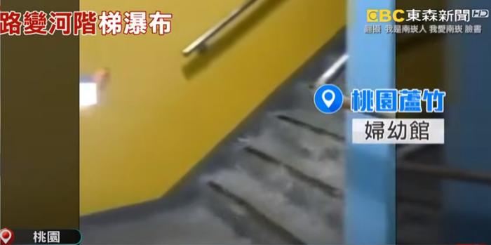 圖為臺灣桃園市蘆竹區(qū)婦女館的樓梯出現(xiàn)“小瀑布”。 圖片來源:臺灣東森新聞網(wǎng)視頻截圖