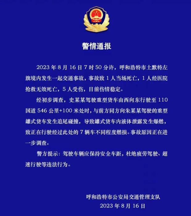 經(jīng)初步調(diào)查,史某某駕駛重型貨車由西向東行駛至110國(guó)道546公里+100米處時(shí),與前方同方向朱某某駕駛的重型罐式貨車發(fā)生追尾碰撞,導(dǎo)致罐式貨車內(nèi)液體泄露發(fā)生爆燃,致正在行駛經(jīng)過此處的7輛車不同程度燃損。事故原因正在進(jìn)一步調(diào)查。