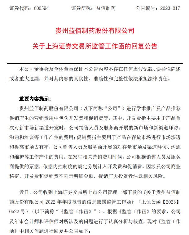 2023年6月,益佰制藥收到上交所年報(bào)監(jiān)管函,被要求補(bǔ)充披露銷售費(fèi)用前五大支付對象;學(xué)術(shù)推廣、營銷平臺(tái)建設(shè)等市場費(fèi)用主要核算內(nèi)容明細(xì)情況;銷售費(fèi)用支付對象中是否涉及公司經(jīng)銷商、關(guān)聯(lián)方或其他利益相關(guān)方等相關(guān)信息。