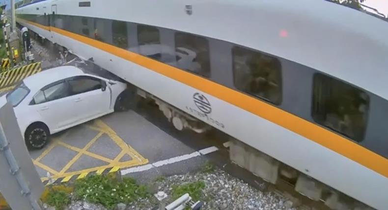 白色轎車直沖行進(jìn)間太魯閣列車,造成列車與轎車毀損。 圖片來源:臺灣《聯(lián)合報》