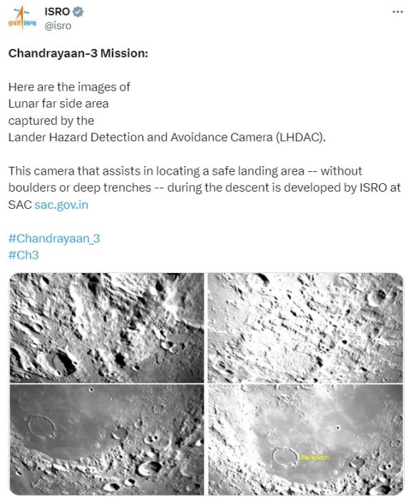 當?shù)貢r間8月21日,ISRO在社交媒體上發(fā)布了“月船3號”上的LHDAC相機(著陸器危險探測與規(guī)避相機)拍攝的月球表面圖像。圖片來源:ISRO社交賬號截圖