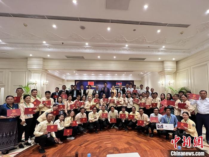8月21日至30日,柬埔寨中文導(dǎo)游海外培訓(xùn)班在暹粒舉行,來自金邊和暹粒兩地的60名中文導(dǎo)游及旅游從業(yè)者參加培訓(xùn)學(xué)習(xí)。圖為8月30日,柬埔寨中文導(dǎo)游海外培訓(xùn)班結(jié)業(yè)典禮。 中新社發(fā) 項目團隊供圖