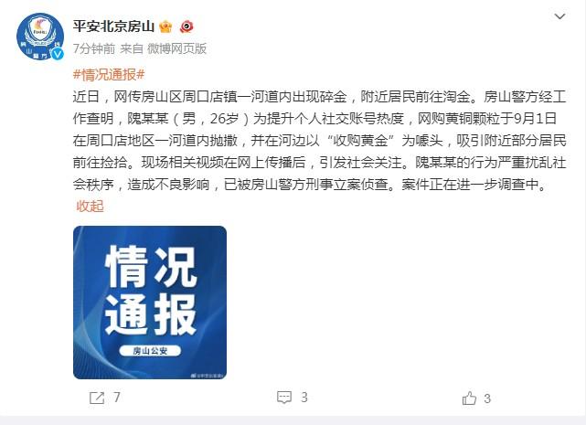 中新網(wǎng)9月3日電 3日,北京市公安局房山分局官方微博發(fā)布情況通報(bào)稱,近日,網(wǎng)傳房山區(qū)周口店鎮(zhèn)一河道內(nèi)出現(xiàn)碎金,附近居民前往淘金。房山警方經(jīng)工作查明,隗某某(男,26歲)為提升個(gè)人社交賬號(hào)熱度,網(wǎng)購(gòu)黃銅顆粒于9月1日在周口店地區(qū)一河道內(nèi)拋撒,并在河邊以“收購(gòu)黃金”為噱頭,吸引附近部分居民前往撿拾?,F(xiàn)場(chǎng)相關(guān)視頻在網(wǎng)上傳播后,引發(fā)社會(huì)關(guān)注。隗某某的行為嚴(yán)重?cái)_亂社會(huì)秩序,造成不良影響,已被房山警方刑事立案?jìng)刹椤0讣谶M(jìn)一步調(diào)查中。