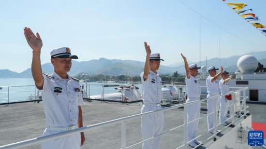 9月3日,中國海軍“和平方舟”號醫(yī)院船抵達(dá)東帝汶帝力港,任務(wù)官兵向迎接人群揮手致意。新華社發(fā)(徐巍 攝)