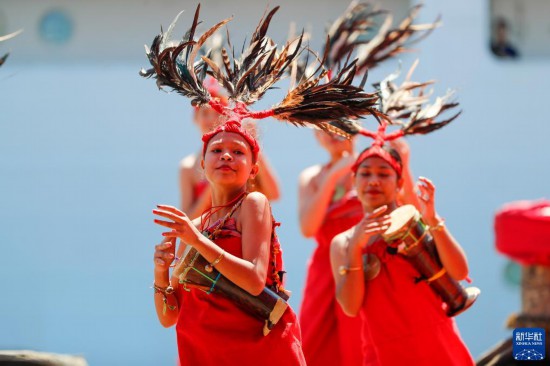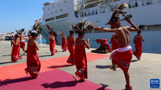9月3日,中國海軍“和平方舟”號醫(yī)院船抵達(dá)東帝汶帝力港,當(dāng)?shù)孛癖姳硌萏厣栉铓g迎。新華社發(fā)(徐巍 攝)