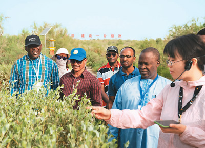 近日,來(lái)自非洲的專家在中國(guó)新疆參加中非治沙培訓(xùn)班。圖為在塔克拉瑪干沙漠腹地塔中植物園,中方技術(shù)人員向非洲學(xué)員介紹荒漠植物。