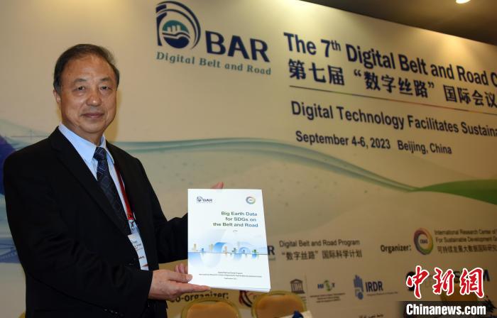 9月4日,第七屆“數(shù)字絲路”國(guó)際會(huì)議在北京開(kāi)幕,DBAR主席郭華東院士展示當(dāng)天最新發(fā)布的《地球大數(shù)據(jù)助力“一帶一路”可持續(xù)發(fā)展》報(bào)告。中新網(wǎng)記者 孫自法 攝