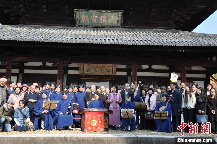 2012年4月8日,上海城隍廟道樂(lè)團(tuán)與日本觀(guān)眾在萬(wàn)福寺大雄寶殿前合影。 (上海市道教協(xié)會(huì)供圖)
