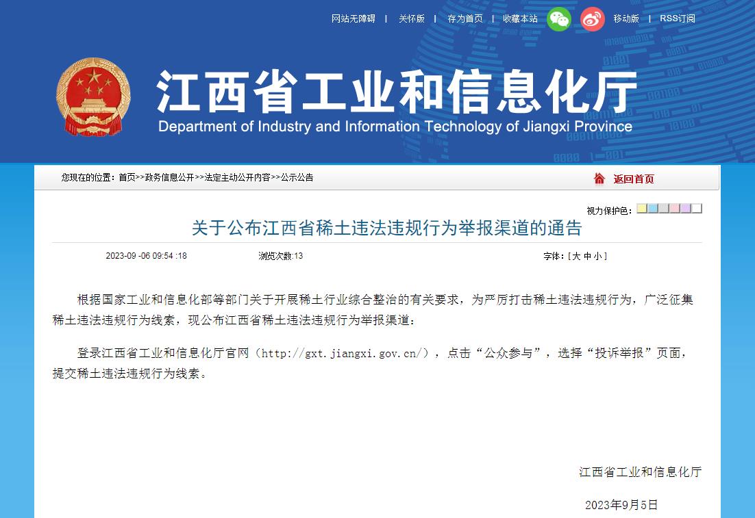 中新網(wǎng)9月6日電 據(jù)江西省工業(yè)和信息化廳官網(wǎng)6日消息,根據(jù)國(guó)家工業(yè)和信息化部等部門關(guān)于開(kāi)展稀土行業(yè)綜合整治的有關(guān)要求,為嚴(yán)厲打擊稀土違法違規(guī)行為,廣泛征集稀土違法違規(guī)行為線索,現(xiàn)公布江西省稀土違法違規(guī)行為舉報(bào)渠道:登錄江西省工業(yè)和信息化廳官網(wǎng),點(diǎn)擊“公眾參與”,選擇“投訴舉報(bào)”頁(yè)面,提交稀土違法違規(guī)行為線索。